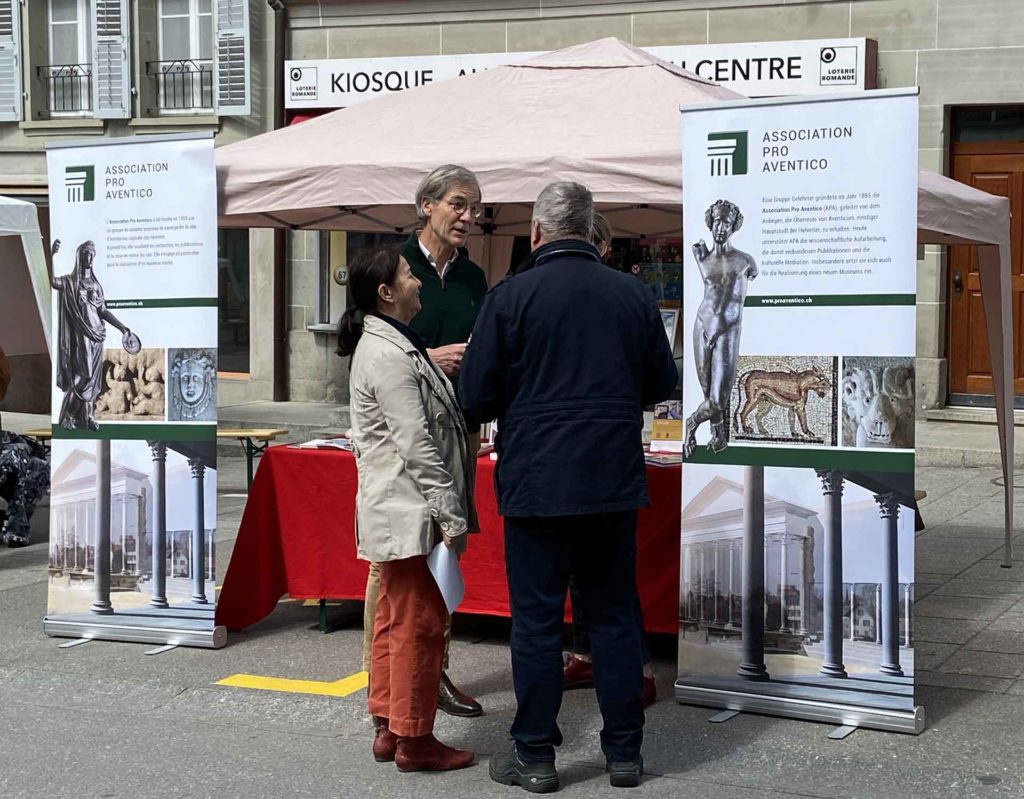 Emmenée par le président de l’Association Pro Aventico, Stefan Bichsel, une petite équipe de volontaires s’est relayée de 10h à 14h pour faire étalage des nombreux engagements de notre association en faveur du site antique d’Aventicum. Composé de Martial Meystre (vice-président), Jean-Paul Dal Bianco (membre du comité) ainsi que de Francesca Arghirò et Yannick Andrey (guides du site), ce petit groupe a accueilli et informé, à tour de rôle, les nombreuses personnes intéressées et curieuses. Que chacune et chacun soit remercié-e ici chaleureusement.